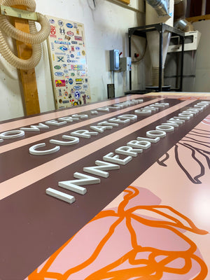 Loading image: a photo of the finished Innerbloom sign standing outside