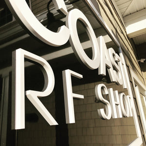 Loading image: a photo of a K-Coast Surf Shop sign with a white border and lettering on a black background