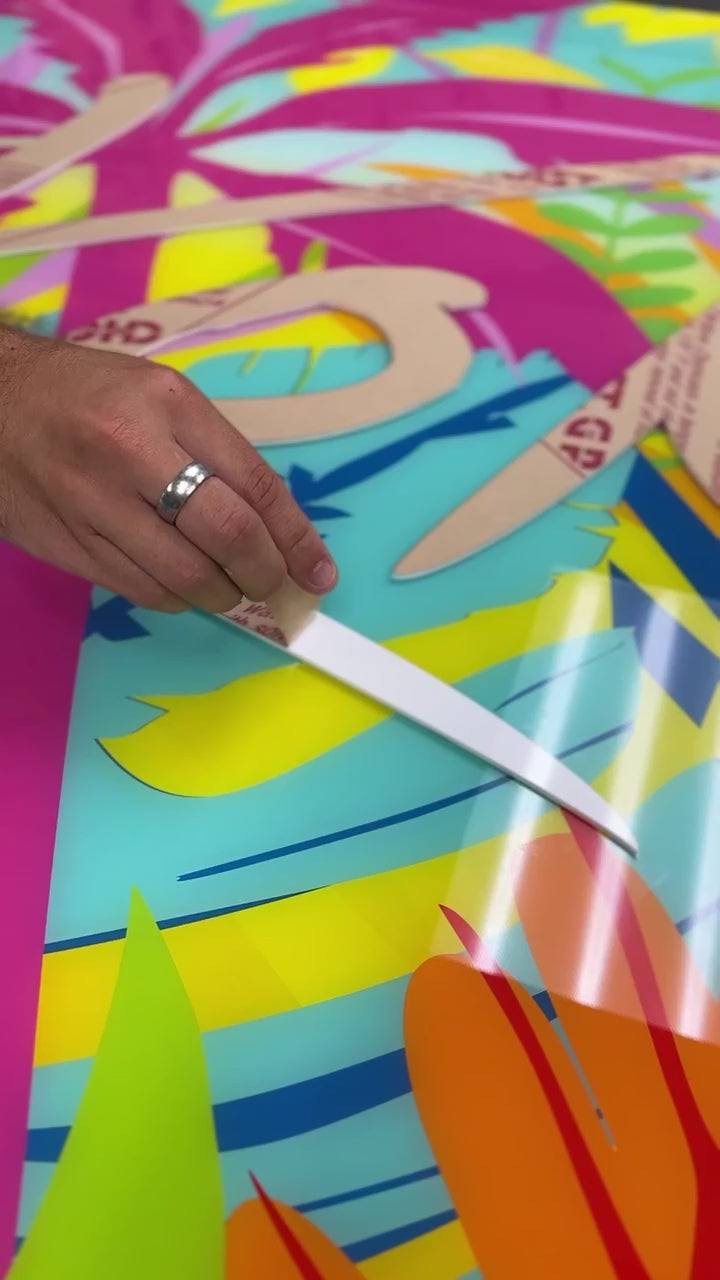 Loading image: a photo of the Kokomo Suites sign with raised white lettering on a colorful acrylic background
