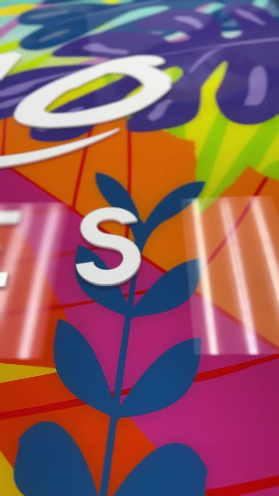 Loading image: an angled closeup of the Kokomo Suites sign showing the raised white lettering on a colorful acrylic background