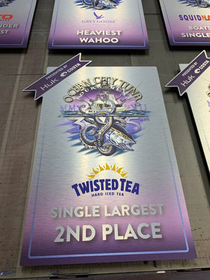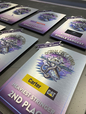 Loading image: a photo of awards for the 2022 OC Tuna Tournament printed on brushed aluminum