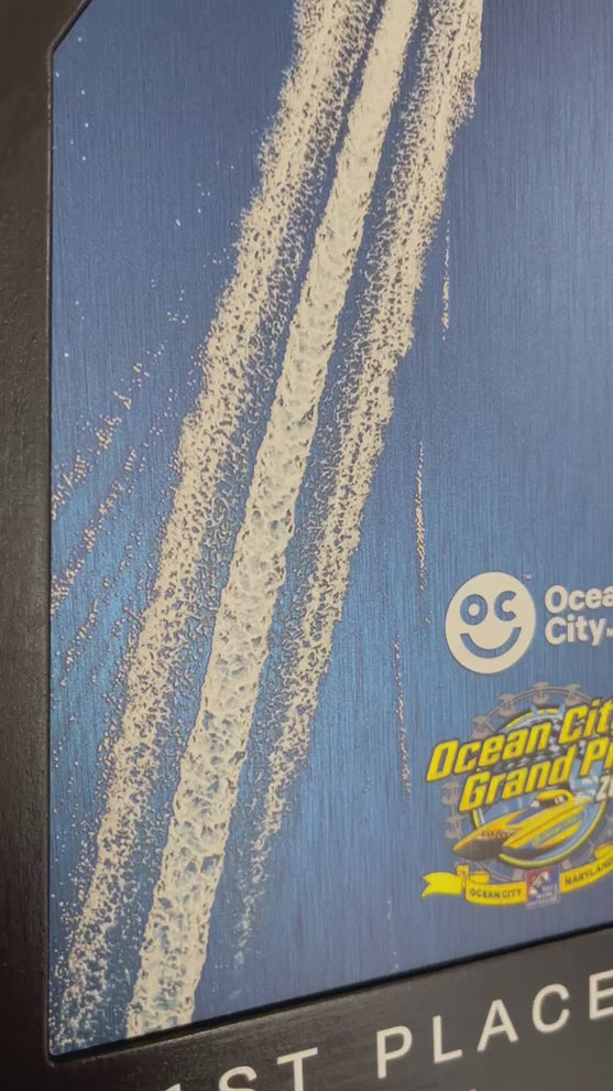 Loading image: a photo showing the different ranking awards for the Ocean City Grand Prix 2024, all a black wooden quadrilateral shape with an inset photo of a boat's wake