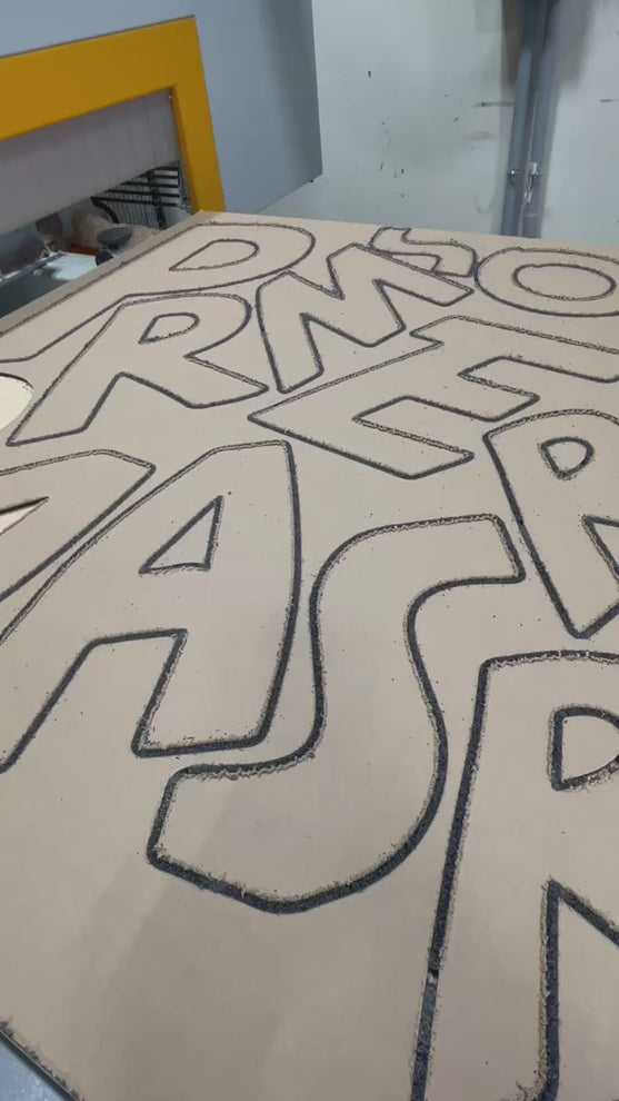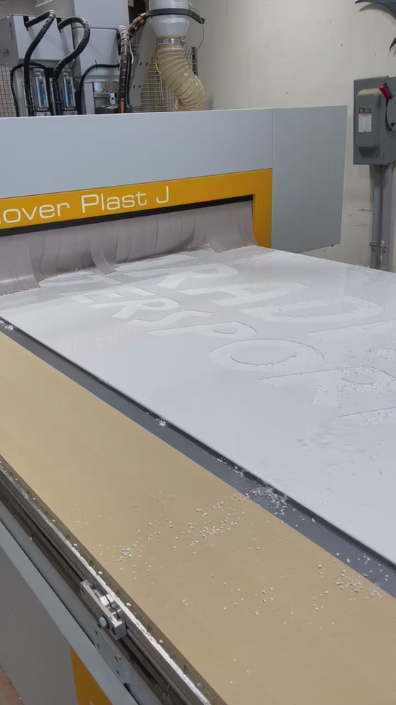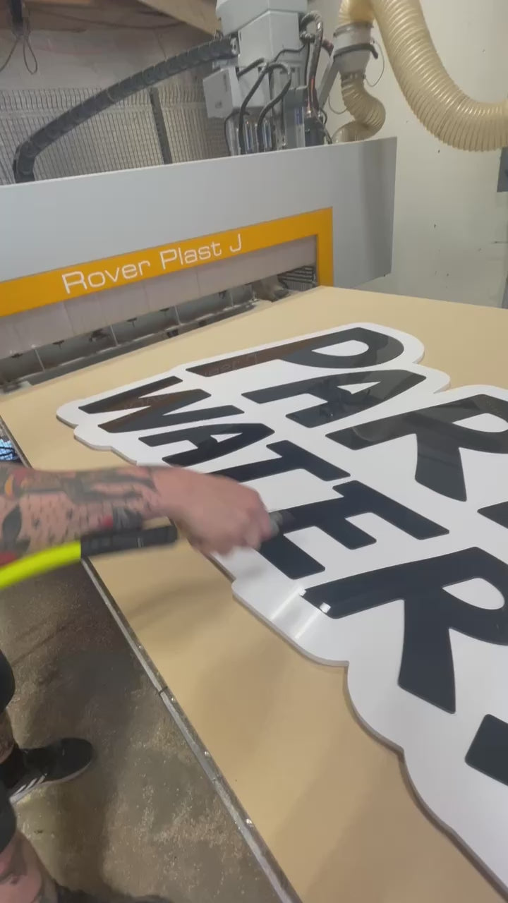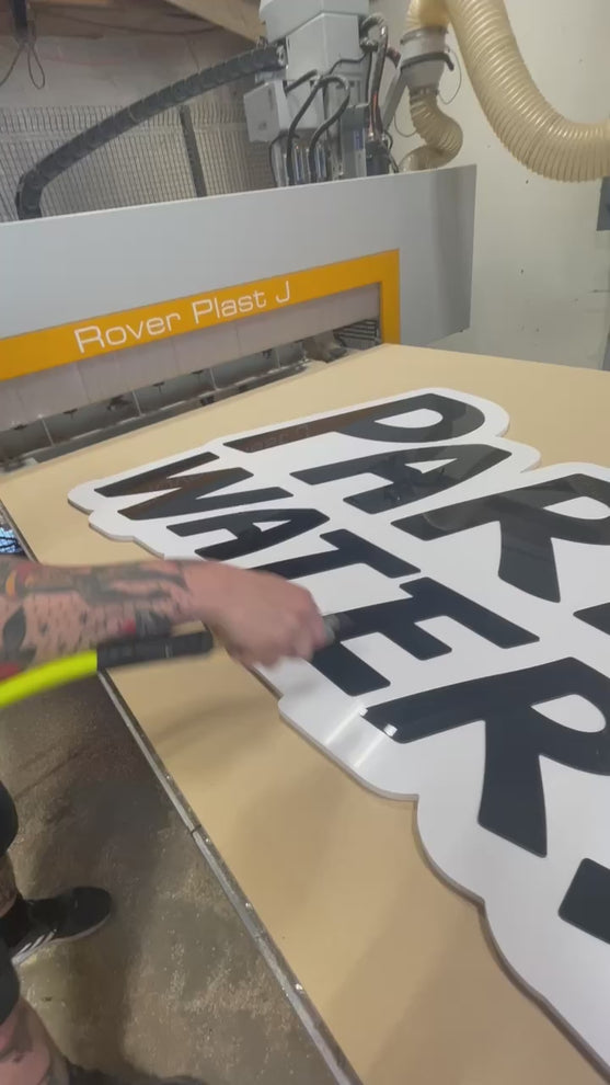 Loading image: an 8 by 16 foot 2D-style sign with a black background, an orange and yellow gradient Paradise Watersports logo, and white text