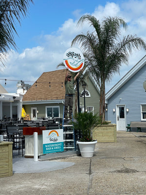 Loading image: Outdoor setting with 'The Wedge' sign and people sitting under yellow umbrellas.