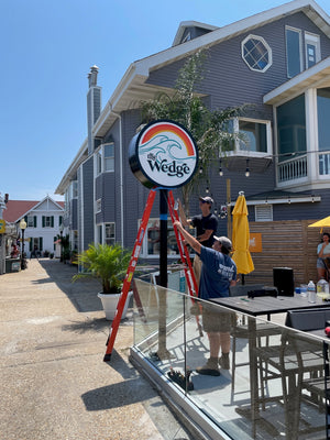 Loading image: White building with 'the Wedge' sign on a clear day by the water