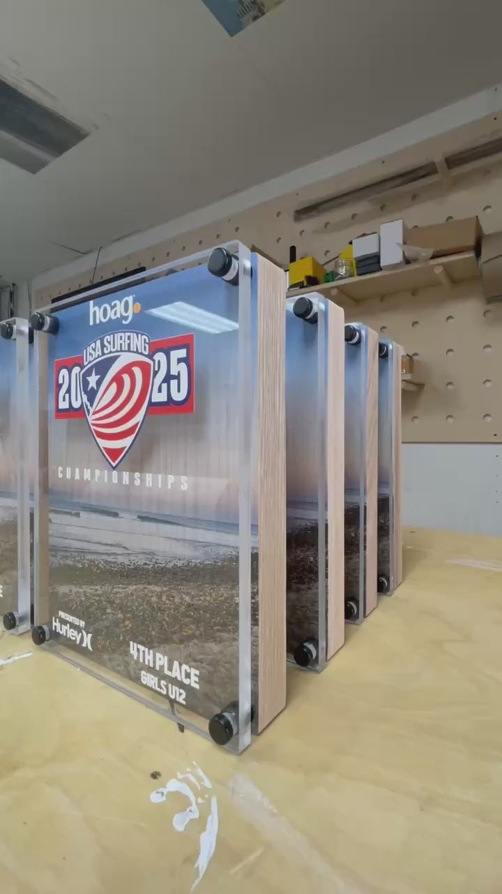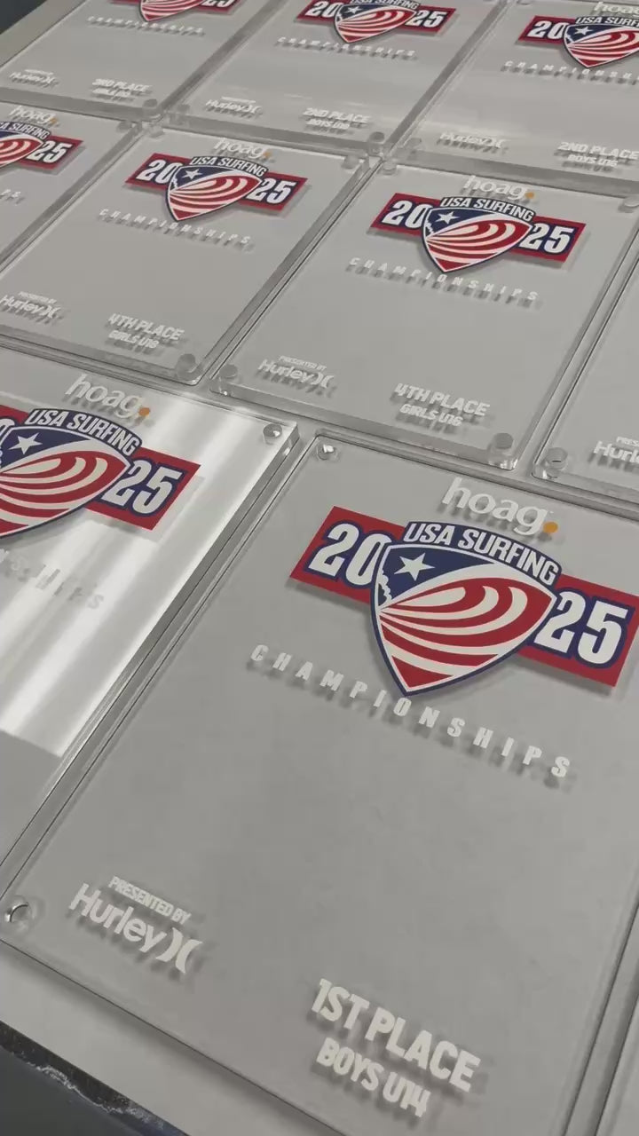 Loading image: an angled photo of the 2025 USA Surfing Championship awards showing the raised acrylic layer